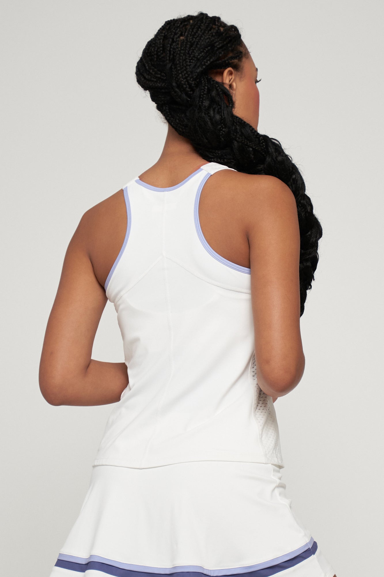 This gorgeous tank has a V neckline and contrast on the sides, neckline and armholes. It has a sporty slim racerback and is a body skimming fit